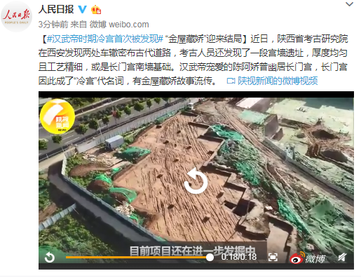近日,陜西省考古研究院在西安發(fā)現(xiàn)兩處車轍密布古代道路,考古人員還發(fā)現(xiàn)了一段宮墻遺址,厚度均勻且工藝精細,或是長門宮南墻基礎(chǔ)。漢武帝寵愛的陳阿嬌曾幽居長門宮,長門宮因此成了“冷宮”代名詞,有金屋藏嬌故事流傳。