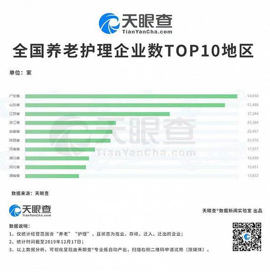 天眼查數(shù)據(jù)顯示,近年來(lái),我國(guó)養(yǎng)老護(hù)理類(lèi)企業(yè)數(shù)上升明顯。截至2019年12月17日,養(yǎng)老護(hù)理類(lèi)企業(yè)數(shù)已突破42萬(wàn)家。廣東省、山東省、江蘇省、浙江省、安徽省的養(yǎng)老護(hù)理企業(yè)注冊(cè)數(shù)量均超過(guò)2萬(wàn)家。