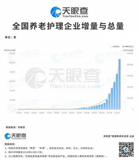 2013年被認(rèn)為是標(biāo)志性的中國(guó)養(yǎng)老產(chǎn)業(yè)元年。天眼查數(shù)據(jù)顯示,2013年以來(lái),我國(guó)養(yǎng)老護(hù)理類(lèi)企業(yè)數(shù)的增幅穩(wěn)步加大。2014年,養(yǎng)老服務(wù)企業(yè)數(shù)量超過(guò)20000家,2016年,養(yǎng)老護(hù)理企業(yè)數(shù)量超過(guò)40000家。截至目前,2019年,新增企業(yè)數(shù)便超過(guò)10萬(wàn)家,是五年前的10倍,十年前的14倍。