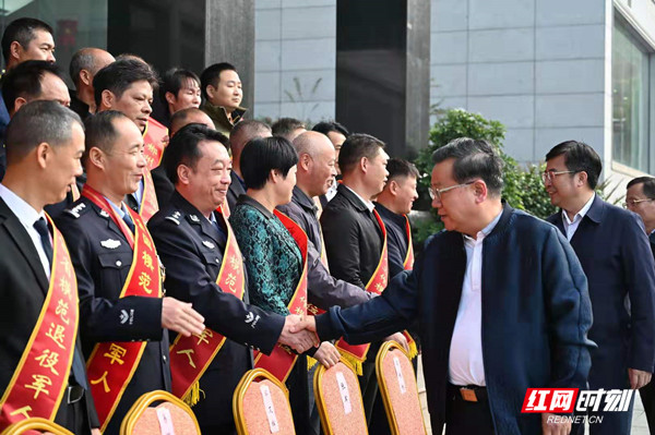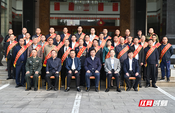 11月5日上午,郴州召開全市優(yōu)秀退役軍人表彰會(huì)議。會(huì)前,郴州市委書記易鵬飛與優(yōu)秀退役軍人合影。