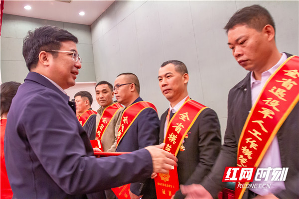郴州市委副書記鄒文輝(左一)在表彰大會(huì)上給全市退役軍人頒獎(jiǎng)。