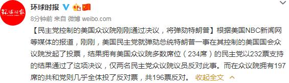 根據(jù)美國(guó)NBC新聞網(wǎng)等媒體的報(bào)道,剛剛,美國(guó)民主黨就彈劾總統(tǒng)特朗普一事在其控制的美國(guó)國(guó)會(huì)眾議院發(fā)起了投票,結(jié)果擁有美國(guó)眾議院多數(shù)席位(234席)的民主黨以232票支持的結(jié)果通過(guò)了這項(xiàng)決議,僅兩名民主黨眾議院議員反對(duì)此事。而在眾議院擁有197席的共和黨則幾乎全體投了反對(duì)票,共196票反對(duì)。