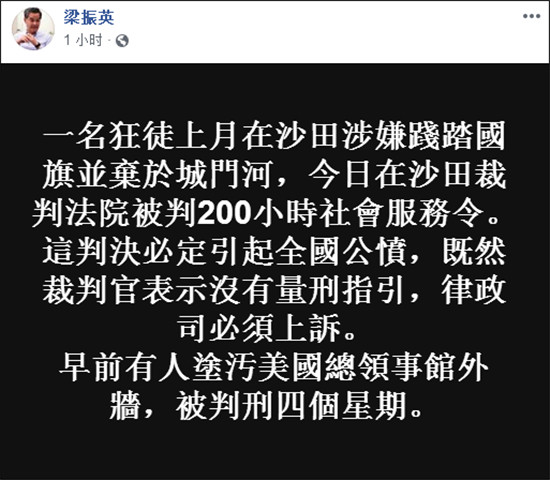 據(jù)大公文匯全媒體報(bào)道,29日,一名21歲男子上月在沙田涉嫌踐踏國旗并棄于城門河,早前承認(rèn)一項(xiàng)侮辱國旗罪,在沙田裁判法院被判200小時(shí)社會(huì)服務(wù)令。判決出來后,不少香港網(wǎng)友表示不滿。全國政協(xié)副主席梁振英在社交媒體發(fā)文稱,這種判決,律政司必須上訴。